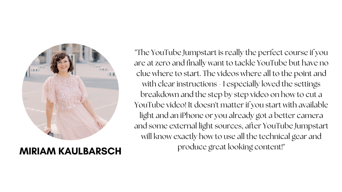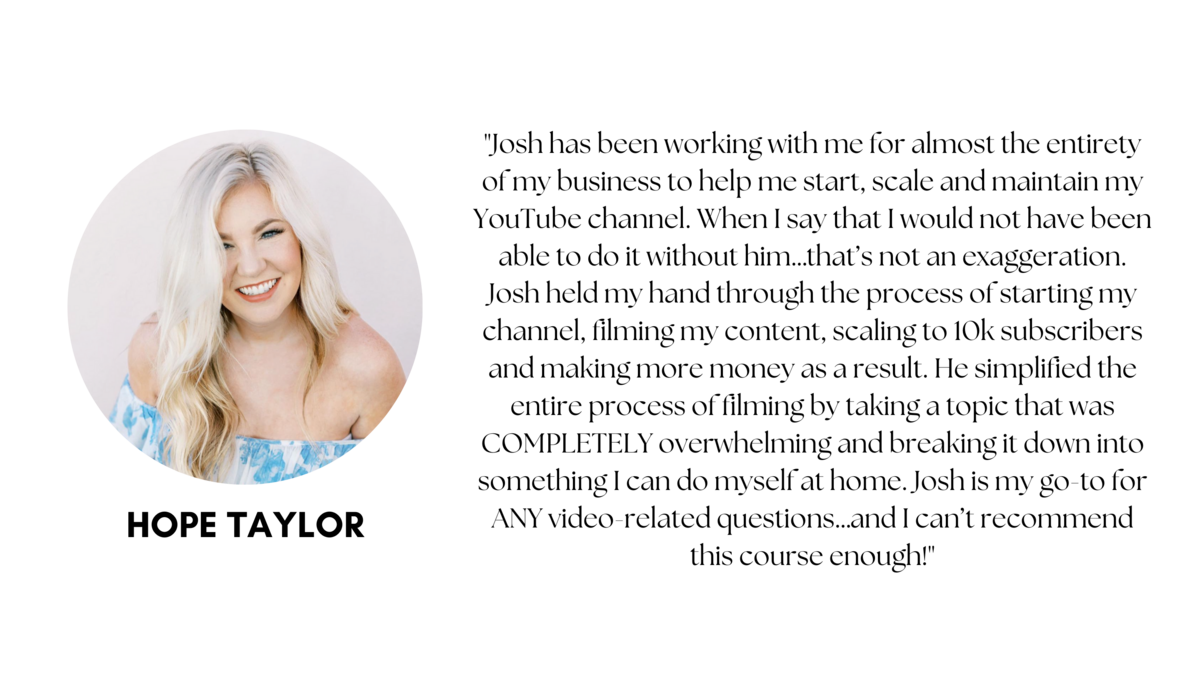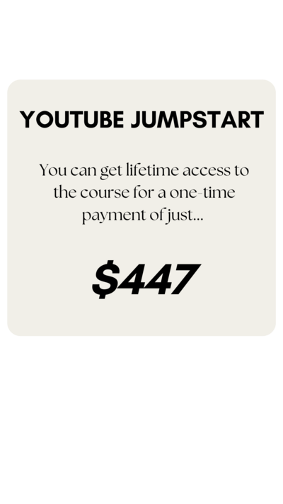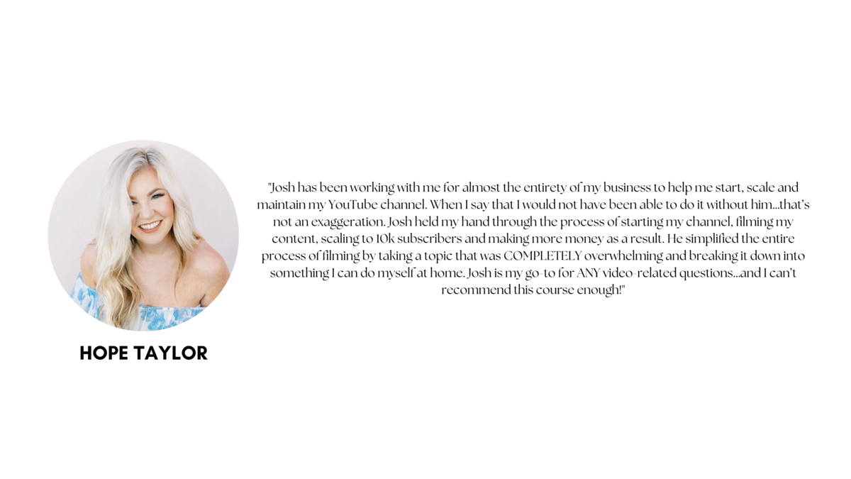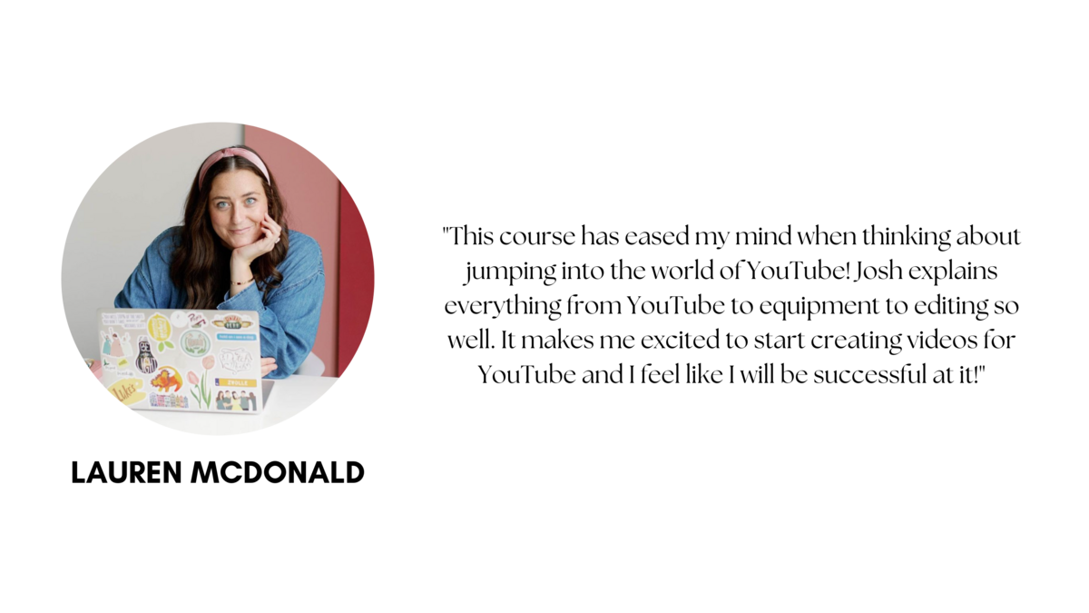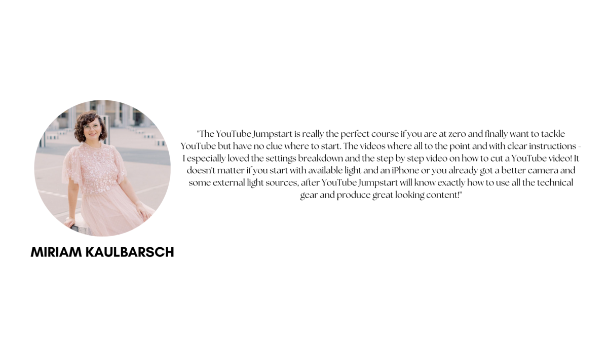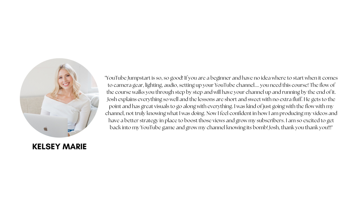 YouTube Jumpstart is aimed at those who have a beginner to intermediate knowledge of YouTube and video production. If you already have a wealth of knowledge of YouTube and the technical aspects it takes to create a great video, then I would not recommend this course. If this sounds like you, then you might be a great candidate for my 1:1 video coaching program.